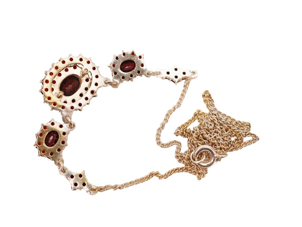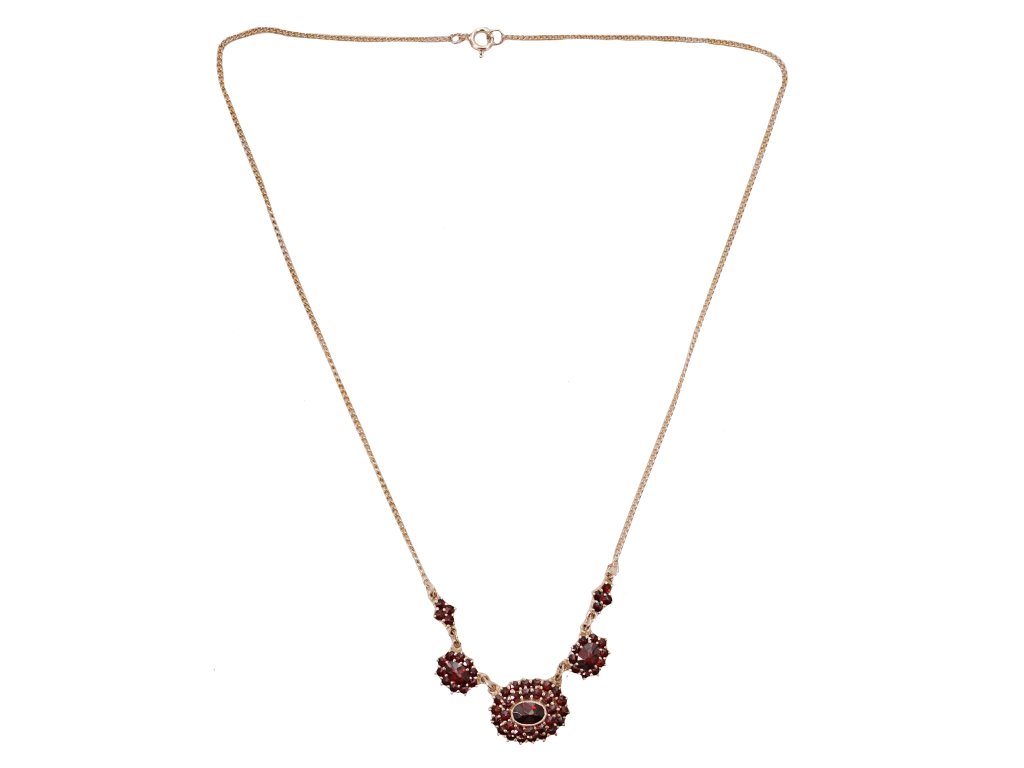 Stříbrný náhrdelník s českými granáty. Váha 7,18 g / 800. Nepoškozen. Puncováno. Délka 44 cm.
