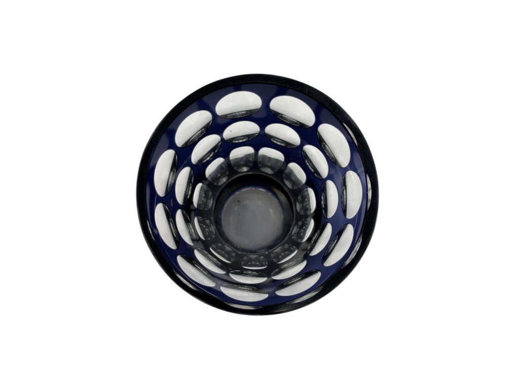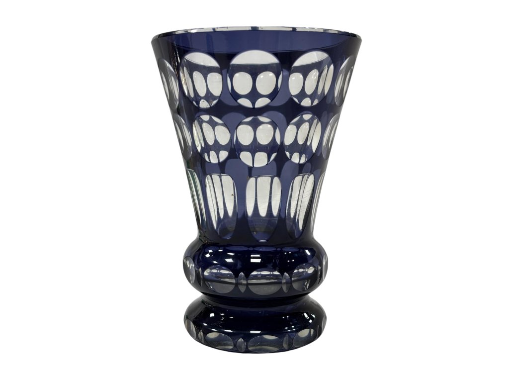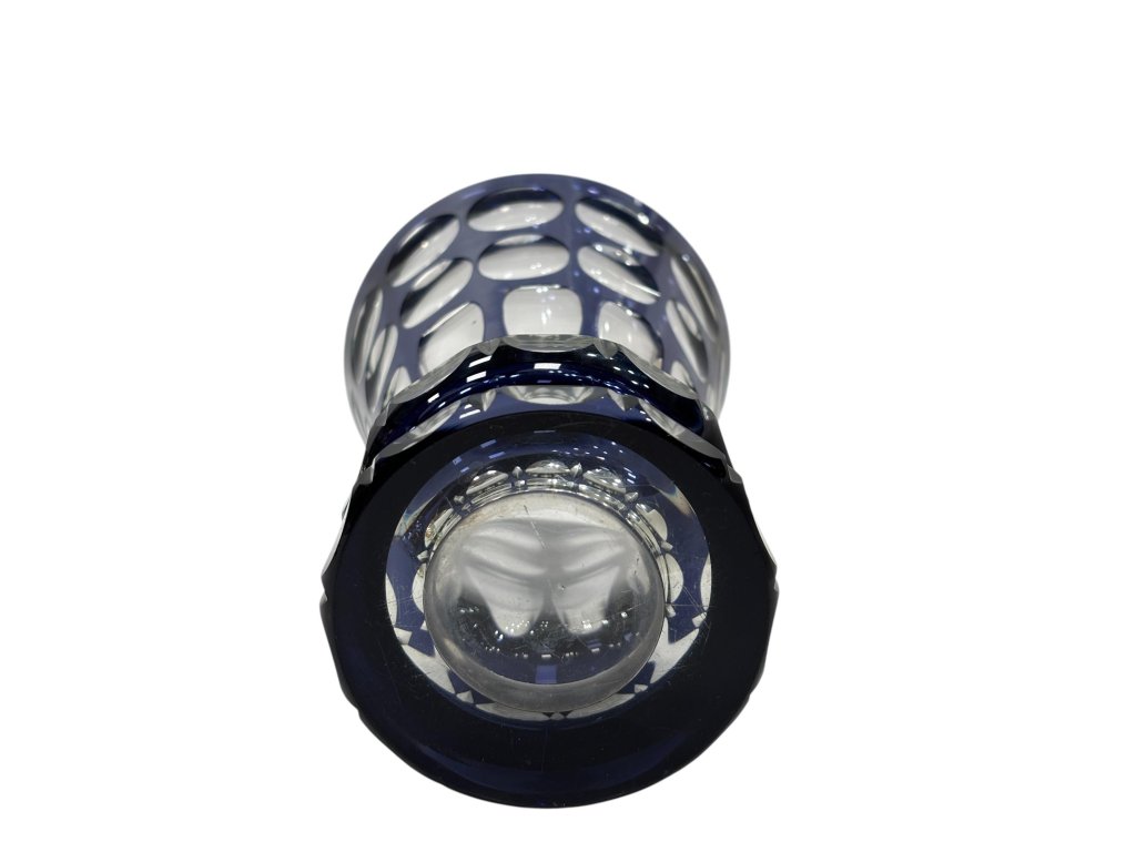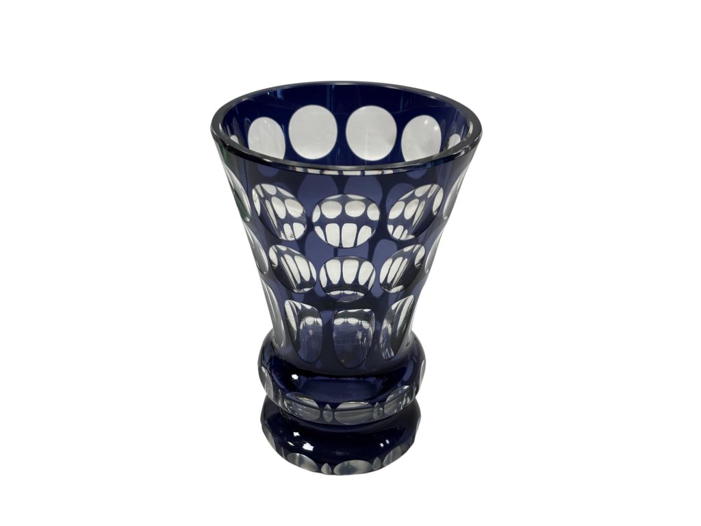 Sklo čiré, vrstvené kobaltovou. Podobný model vázy je publikovaný v katalogu. Johann Ortel, Haida (Nový Bor) 1914.Výška: 16 cmStav: Nepoškozeno