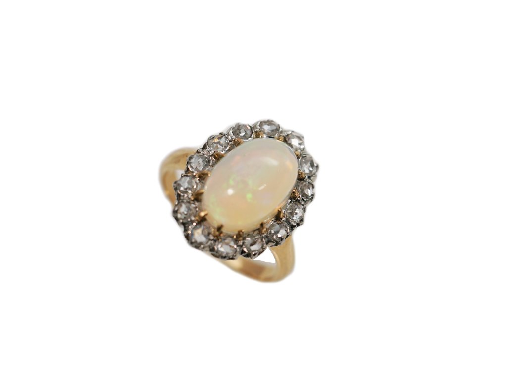 18 karátové zlato. Osazeno brilianty a opálem. Kolem roku 1900. Váha 5,00 g / 750. Velikost prstenu č. 50